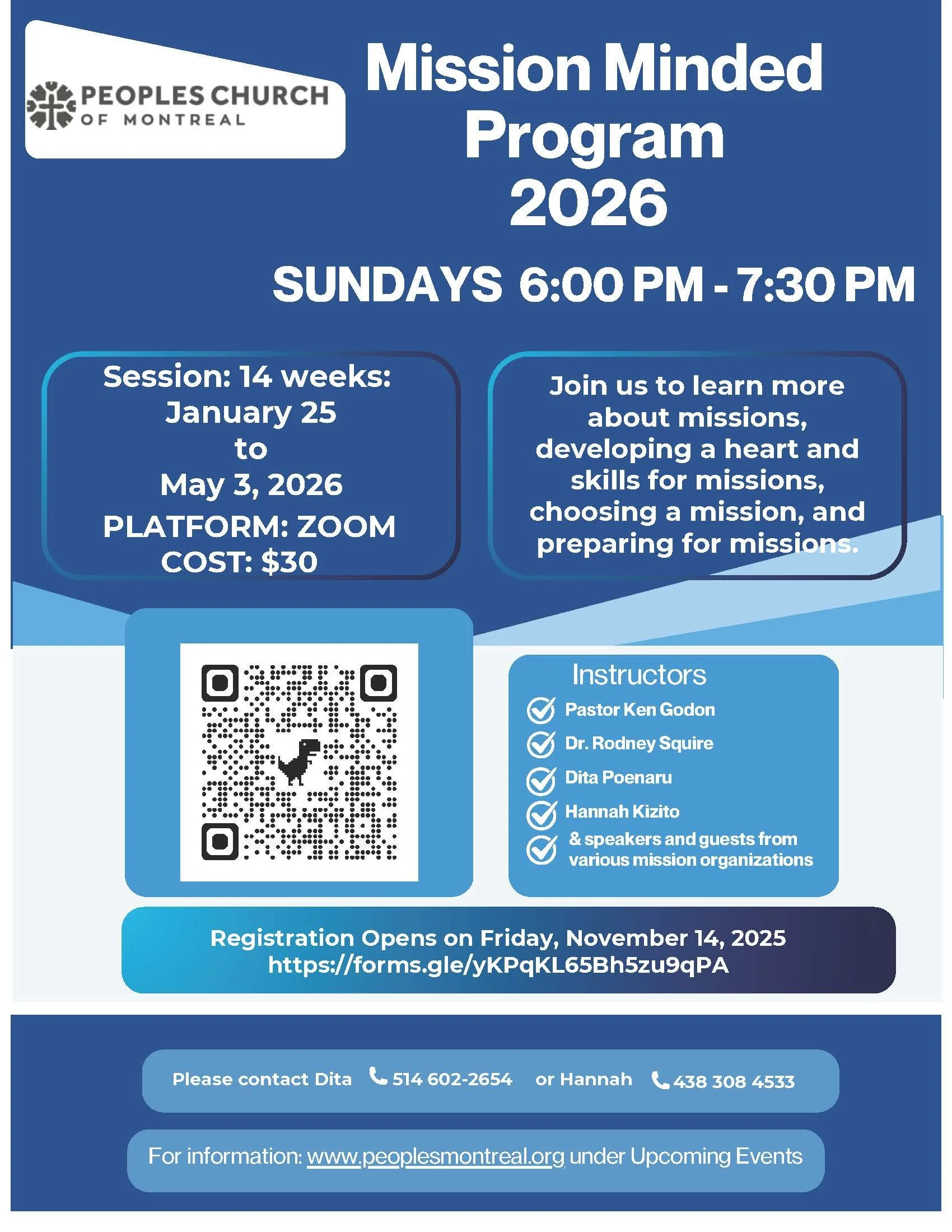 Peoples Church of Montreal's Mission Minded Program Sunday, January 25, 2026 6:00 PM 18:00 Sunday, May 3, 2026 6:00 PM 18:00 2097 Union Ave Montreal Canada (map) Google Calendar ICS